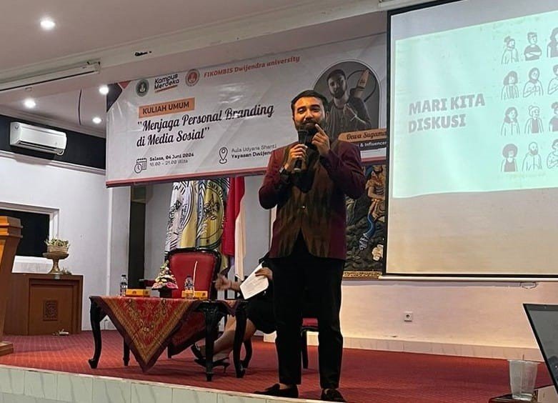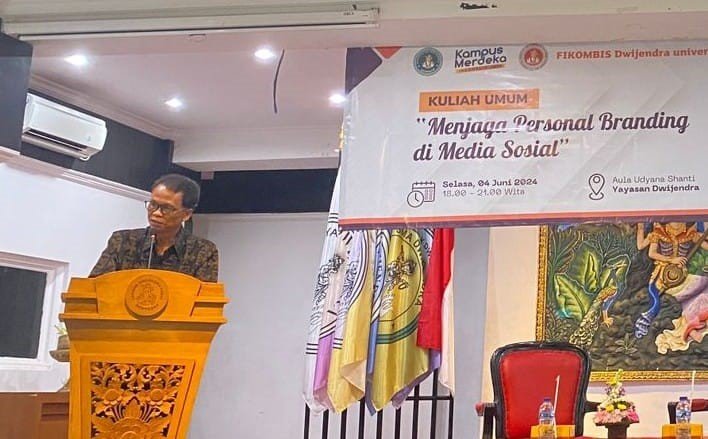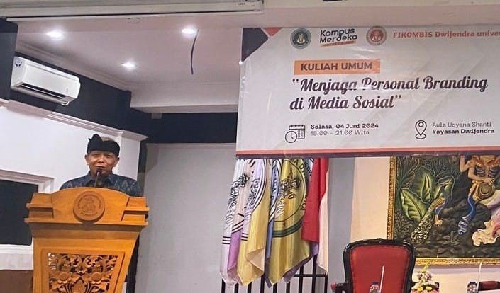 Fakultas Ilmu Komunikasi dan Bisnis Universitas Dwijendra menggelar kuliah umum, dengan mengusung tema “Menjaga Personal Branding di Media Sosial ,” yang diorientasikan agar mahasiswa mampu mengimplementasikan salah satu aspek penting ilmu komunikasi yaitu membangun citra diri dan organisasi. Kuliah umum menghadirkan seorang musisi, sekaligus akademisi dan influencer asal Bali yaitu Dewa Sugama sebagai narasumber tunggal, digelar di Aula Udyana Shanti Yayasan Dwijendra, Selasa (3/06/2024). Dewa Sugama menyampaikan materinya dengan cara sharing pengalaman dan diselingi bernyanyi yang disambut antusias mahasiswa prodi Ilkom