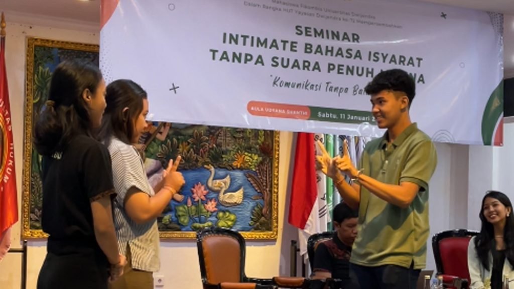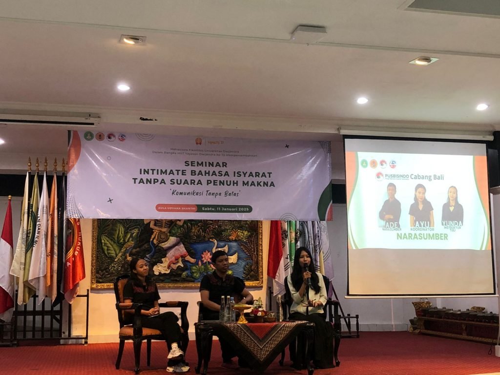 Denpasar, 11 Januari 2025 – Dalam memperingati Hari Tuli Nasional Tahun 2025, dan praktik penyelenggaraan event, mahasiswa semester VII FikomBis Dwijendra University gelar seminar intimate Bahasa Isyarat Tanpa Suara Penuh Makna dengan tema Komunikasi Tanpa Batas, Sabtu, 11 Januari 2025, di Aula Udyana Shanti Yayasan Dwijendra, dimulai pukul 10.00 WITA hingga selesai.