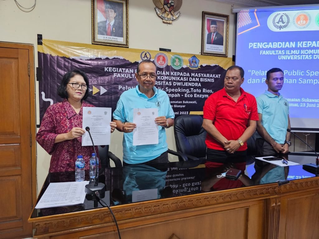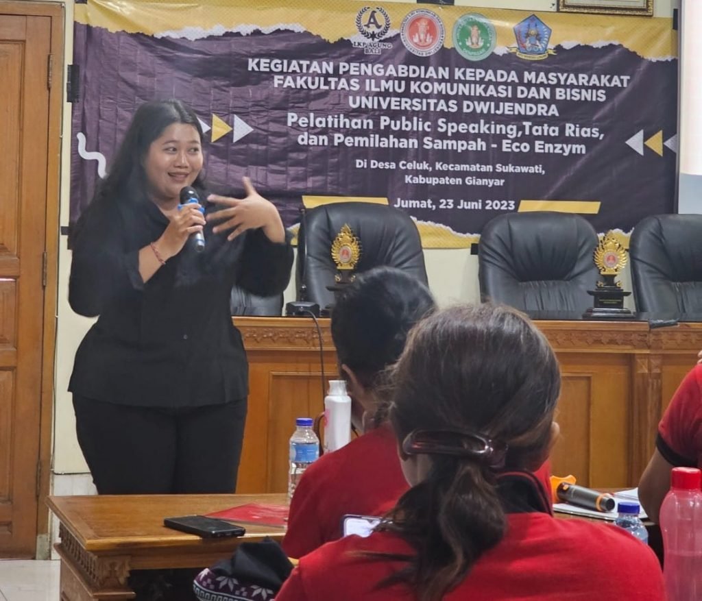 Dosen dan Mahasiswa Prodi Ilmu Komunikasi Fakultas Ilmu Komunikasi dan Bisnis Dwijendra University melaksanakan kegiatan Pengabdian Kepada  Masyarakat (PKM),  Jumat (23/06/2023) bertempat di Aula Kantor Kepala Desa Celuk Gianyar Bali.  PKM dilakukan sebagai wujud implementasi salah satu pilar Tridarma Perguruan Tinggi dengan prioritas kegiatan yakni memberi pelatihan public speaking dan tata rias kepada para pegawai kantor desa dan ibu-ibu anggota PKK. Juga dilakukan kolaborasi dengan Fakultas Teknik Dwijendra University menyosialisasikan Eco Enzyme untuk lingkungan bersih. Kegiatan dibuka oleh Dekan Fikombis dan dihadiri Perbekel Desa Celuk, perangkat desa, tim Salon Agung, Tim Fakultas Teknik, Ketua PKK, BPD dan LPM Desa Celuk Kecamatan Sukawati Gianyar